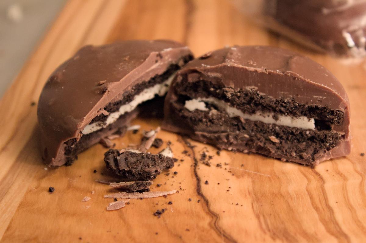 Sweet & creamy Belgian chocolate covering a crunchy chocolate and cream cookie sandwich. Available in your choice of either milk or white chocolate