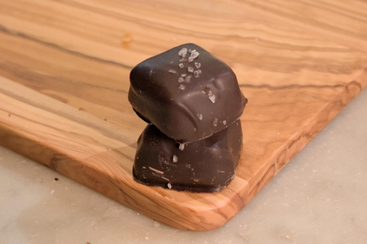 Thick creamy caramels with rich luscious Belgian chocolate and topped withย sea salt.